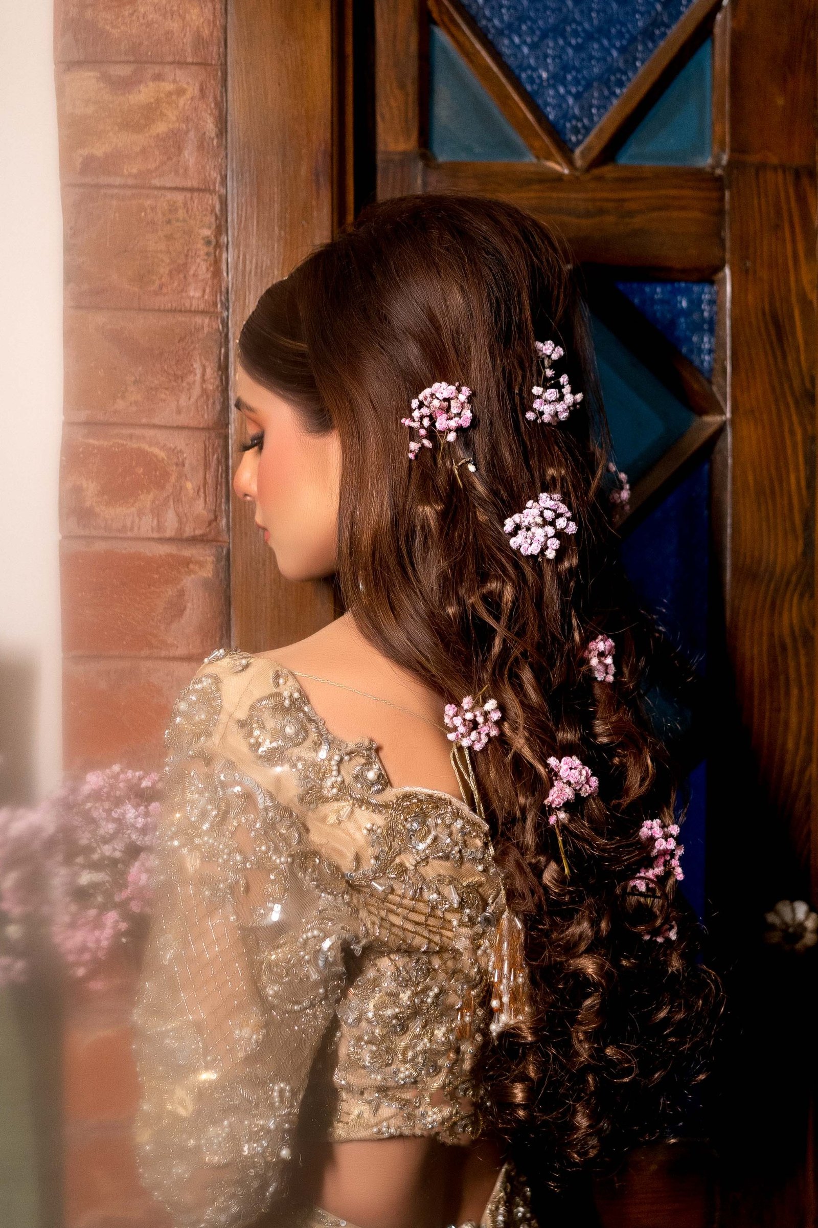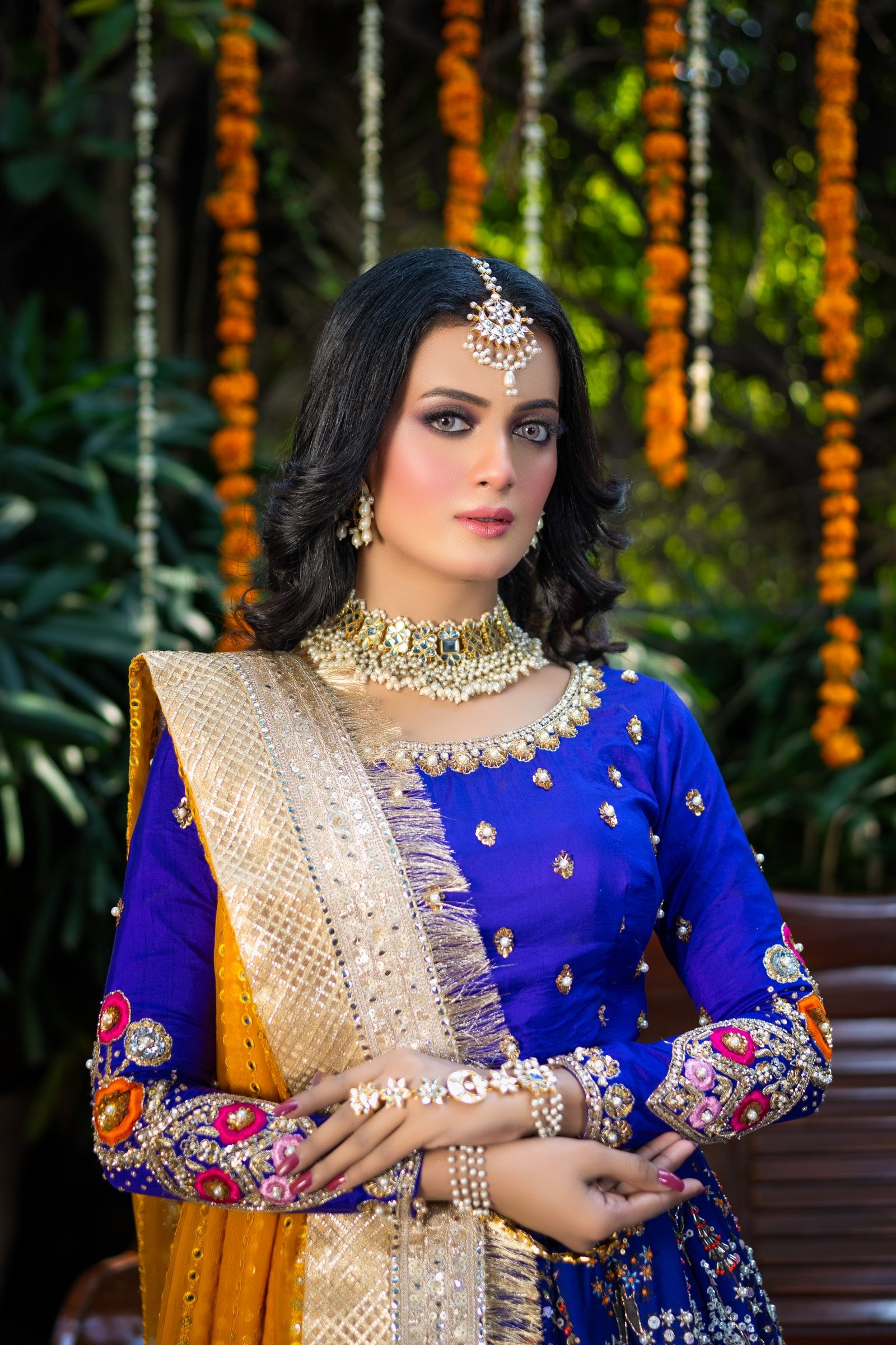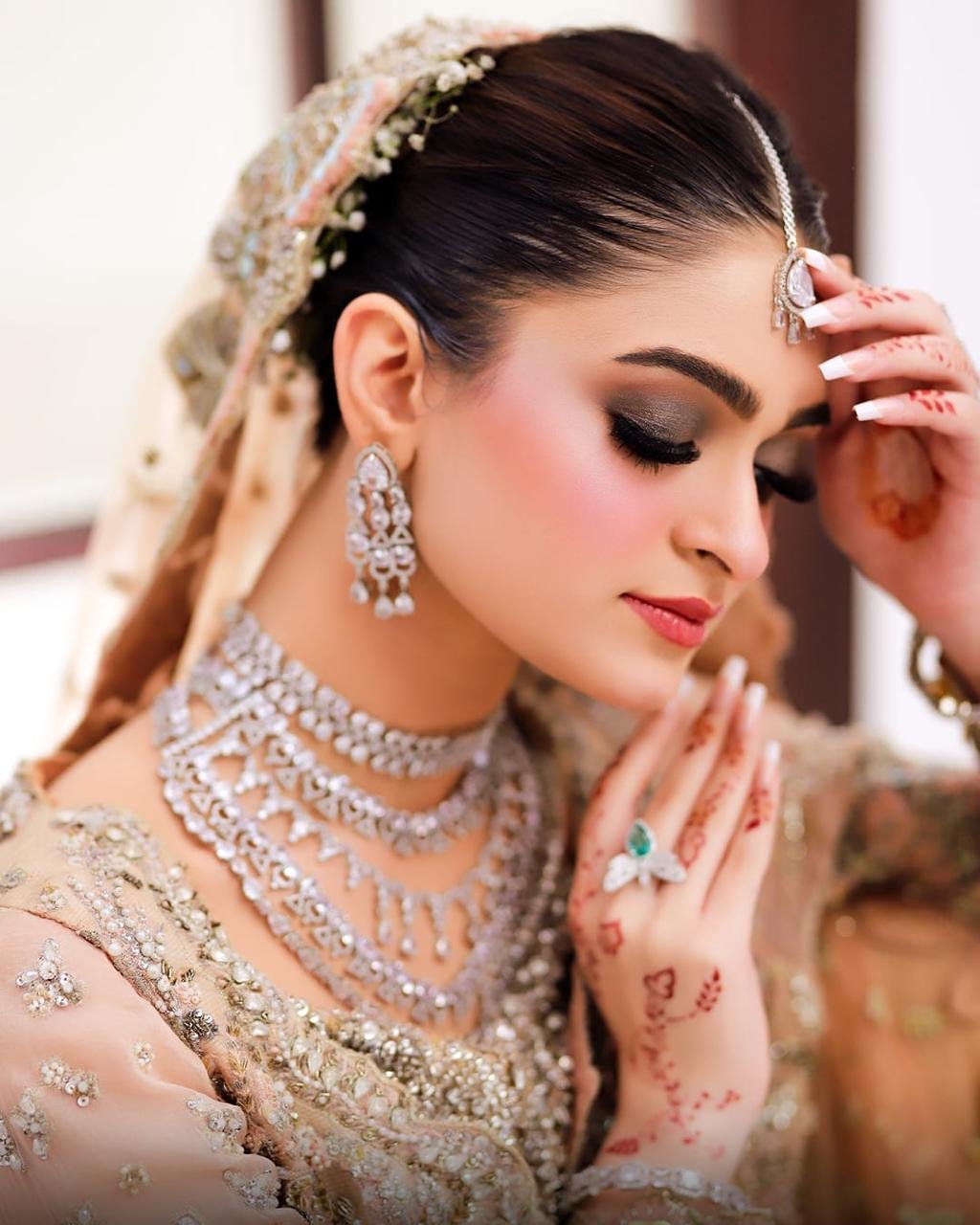Fresh floral tones, lightweight base & vibrant eyes – perfect for Mehndi night.